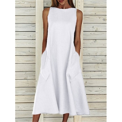 abito midi da donna senza maniche tasche casual silhouette a trapezio scollatura rotonda bianco estivo versatile vestibilità regolare comodo leggero traspirante abbigliamento abbigliamento