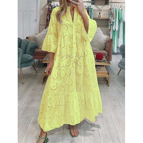 abito lungo da donna bianco con occhielli, maniche a sbuffo, gonna a balze, scollo a V, primavera estate, casual chic, festa in giardino, vacanza, vestibilità regolare