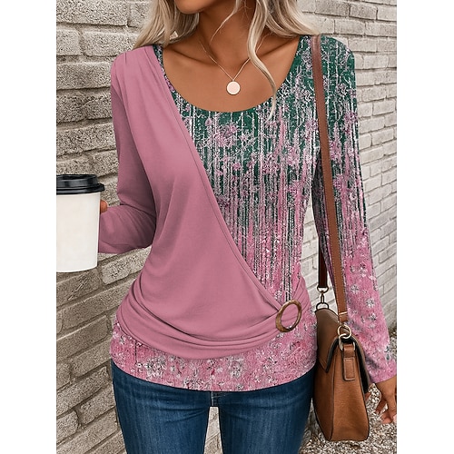 Damen T Shirt Patchwork Druck Ombre Geometrisch Vintage Lässig Langarm Rundhalsausschnitt Normale Oberteile Täglich Blau Rosa Purpur Grün Khaki Sommer Herbst Winter