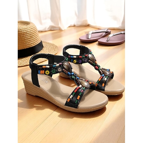 sandali con zeppa bohémien da donna con decorazioni di perline colorate – scarpe estive aperte in stile etnico per la spiaggia, le vacanze e le uscite informali