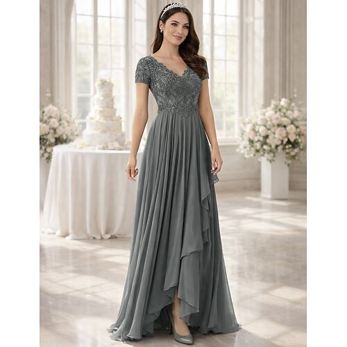 Linea ad A Lunghezza al pavimento Abito da invitata a nozze Abito Formale Abito da sera Abito da cerimonia per signora Manica Corta Scollo a V Elegante Semplice Ospite di nozze Serata Formale