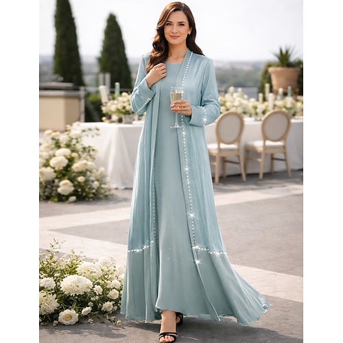 Due Pezzi Linea ad A Lunghezza al pavimento Abito da invitata a nozze Abito da cerimonia per signora Manica Lunga Scollo a Barca Elegante Semplice Lussuoso Formale Raso Organza con Cristalli