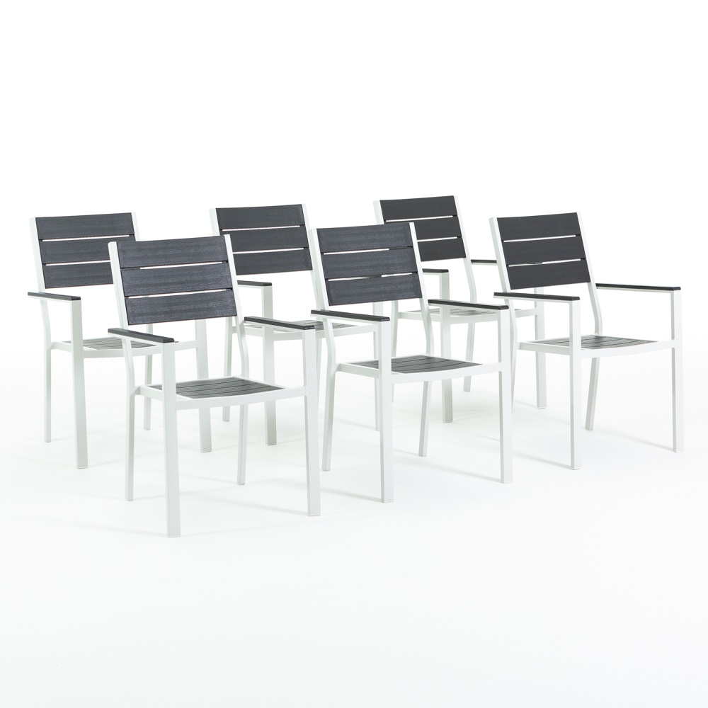 RATTATAN Set 6 stapelbaren Gartenstühlen mit Armlehnen,pulverbeschichtetem Stahlrahmen und Sitzfläche aus Polyethylen-Latten in Holzoptik–Adele–Schiefergrau