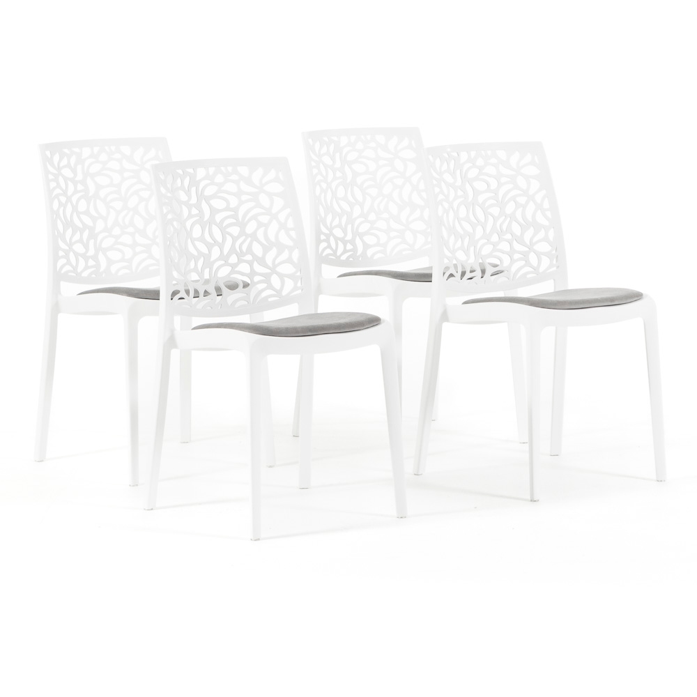 RATTATAN Set aus 4 Stühlen aus Polypropylen mit Glasfaser und Sitzkissen,stapelbar für Küche,Esszimmer,Bar und Restaurant – Anna – Weiß/Grau