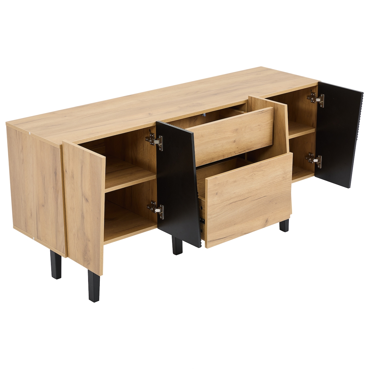 OKWISH modernes Sideboard 40x70x140 cm mit Schubladen, höhenverstellbaren Regalen, Holzmaserung, schwarzem Gitter, robust, vielseitig nutzbar, Farbe Eiche