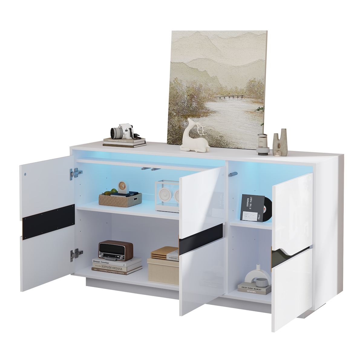 OKWISH Sideboard 140x40x70 cm mit 3 Türen 5 verstellbare Einlegeböden LED Hochglanz Weiß+Schwarz Wohnzimmer Esszimmer Büro