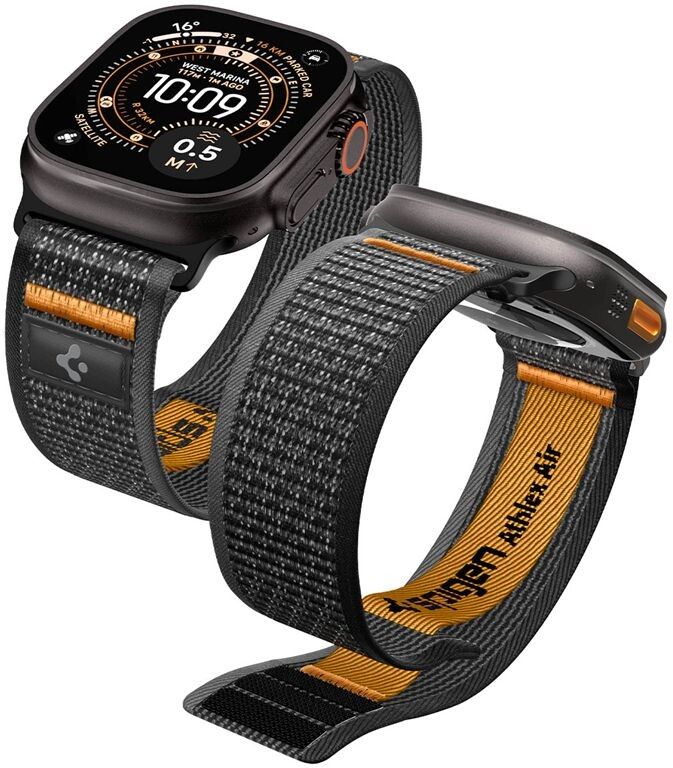 Spigen Athlex Air 2 Active Band (Watch 49/46/45/44 mm) - Svart /oransje - Sportarmband i nylon, lätt, justerbar kardborre, för Apple Watch/Ultra/SE, svart/blå/orange