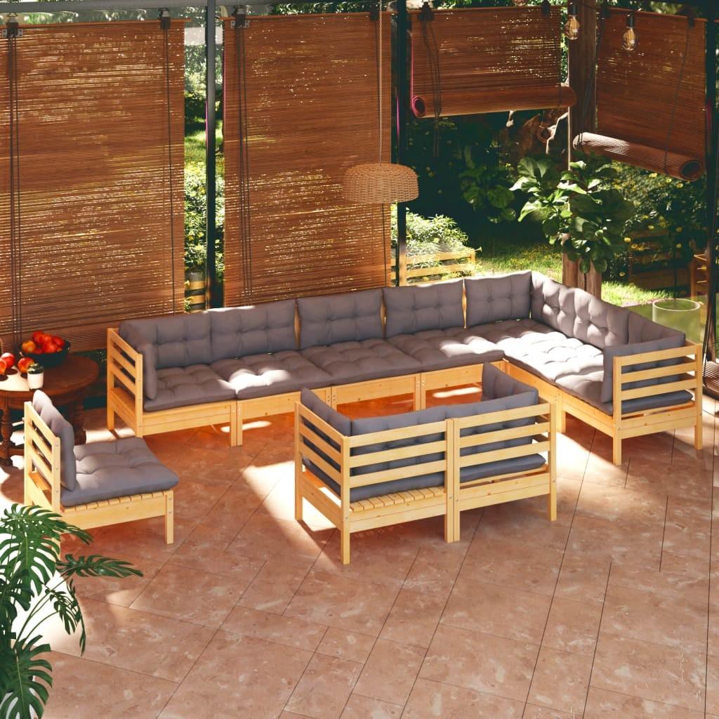 Loungesæt til haven 11 dele med grå hynder massivt fyrretræ