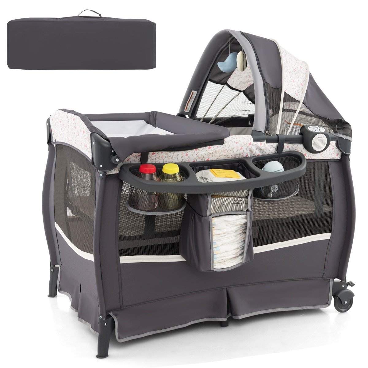 4 i 1 reiseseng med madrass sammenleggbar sideseng med justerbare baldakinblomster