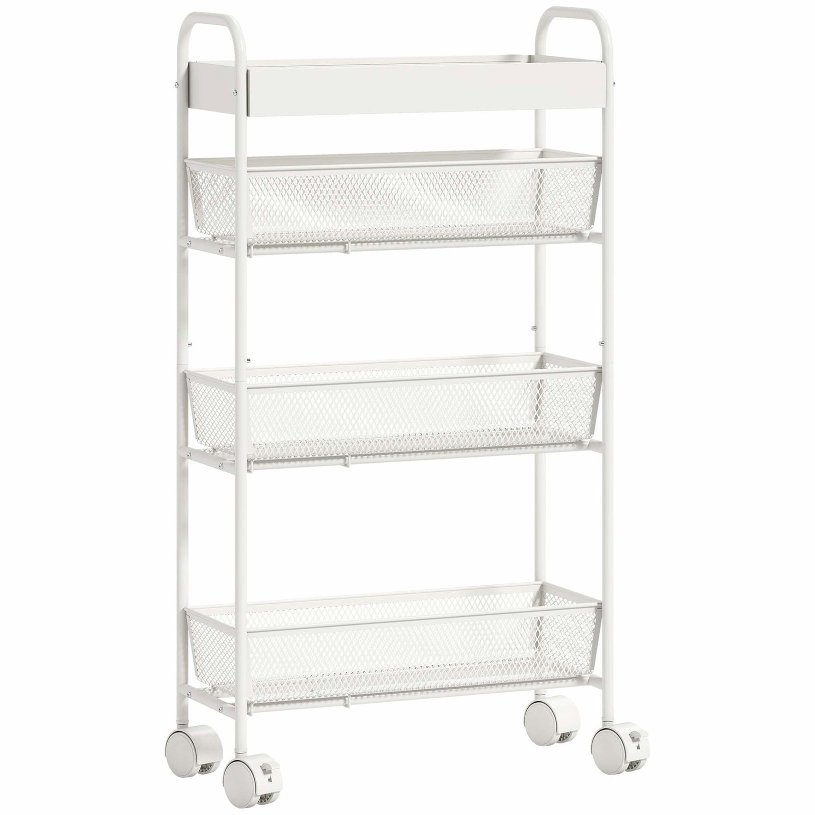 Kjøkkentralle i metall – 3 kurver, slank design, 4 hjul, hvit