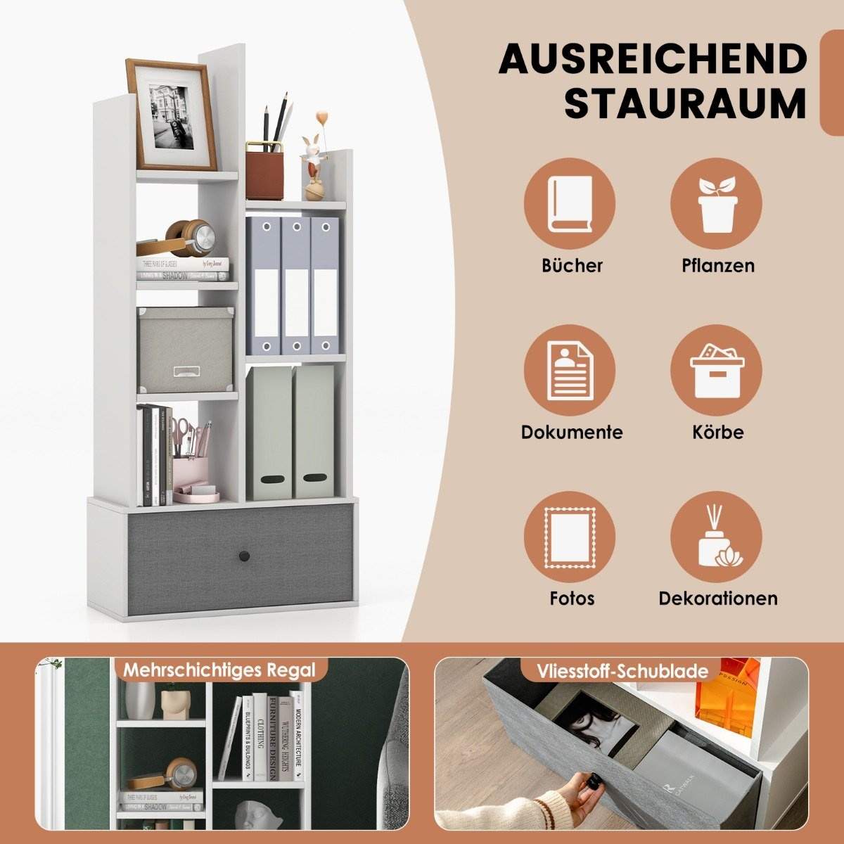 7-lags åpen bokhylle med skuff – Hvit, 53 x 24 x 118 cm