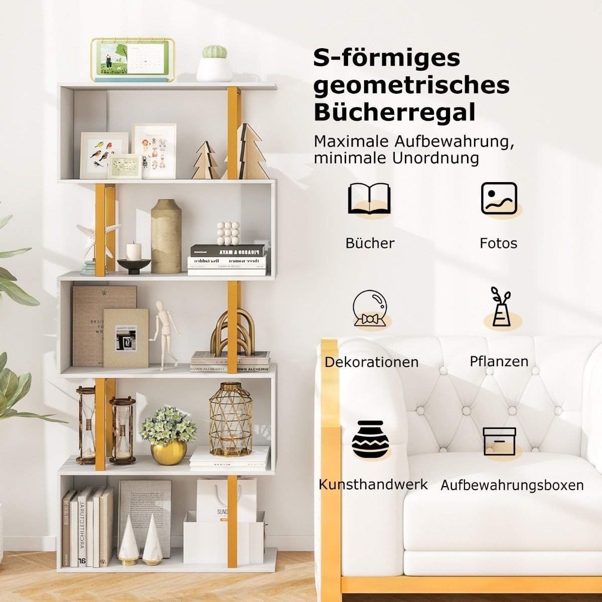 Bokhylle hvit stående hylle med 5 nivåer S-formet kontorhylle frittstående 70 x 24 x 157 cm