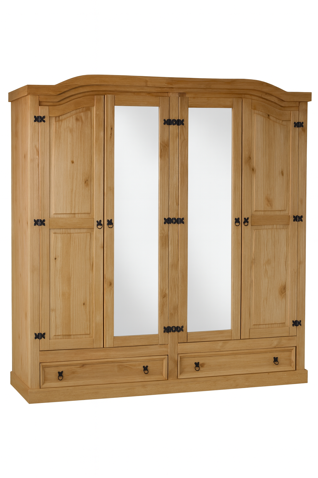 New Mexico klædeskab 4-dørs med 2 spejllåger, 2 fyldningslåger og 2 skuffer. Bredde 194 cm, højde 193 cm lud/voks