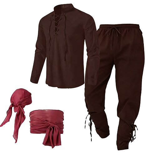 Set Medievale Rinascimento Pantaloni Copricapo Cintura in Vita con accessori Lunghe Pirata Allacciato Tinta unica Costume Per uomo 4 pezzi Costumi da pirata Halloween Carnevale Fiera Rinascimentale