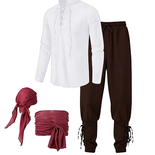 Set Medievale Rinascimento Pantaloni Copricapo Cintura in Vita con accessori Lunghe Pirata Allacciato Tinta unica Costume Per uomo 4 pezzi Costumi da pirata Halloween Carnevale Fiera Rinascimentale