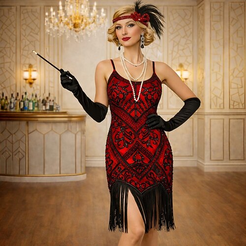 Set Anni Ruggenti Anni 1920 Retrò Vintage Lunghezza al ginocchio Abito Flapper Abito da cocktail Senza maniche Il grande Gatsby Ragazza Flapper Paillettes Frange Costume Per donna Halloween Carnevale