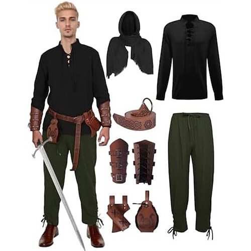 Medievale Rinascimento Pantaloni Cintura in Vita Camicia Lunghe Pirata Vichingo Ranger Allacciato Scollo a V Costume Per uomo Costumi da pirata Mascherata Feste Fiera Rinascimentale LARP Adulti