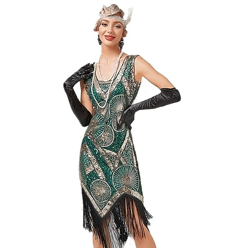 Anni Ruggenti Anni 1920 Lunghezza al ginocchio Vestito Abito Flapper Abiti Senza maniche Il grande Gatsby Paillettes Frangia con nappe Geometrico Scollo a V Costume Per donna Halloween Festa serale