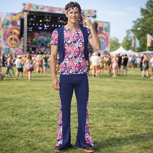 Set Retrò Vintage Anni '70 Pantaloni Camicia Maniche corte Hippie Disco Floreale Paisley Costume Per uomo Halloween Carnevale Festival Musicale Festa a tema retrò Adulti Camicia Pantaloni Copricapo