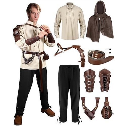 Medievale Rinascimento Pantaloni Camicia Mantello con Cappuccio Lunghe Arciere Pirata Ranger Allacciato Costume Per uomo Costumi da pirata Mascherata Feste Fiera Rinascimentale LARP Adulti Camicia