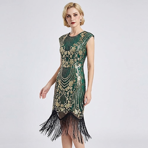 Anni Ruggenti Anni 1920 Lunghezza al ginocchio Abito Flapper Maniche corte Il grande Gatsby Ragazza Flapper Paillettes Frange Tubino Colonna Scollo a V Costume Per donna Natale Carnevale Festa serale