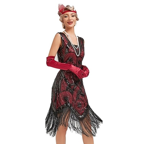 Anni Ruggenti Anni 1920 Lunghezza al ginocchio Vestito Abito Flapper Abiti Senza maniche Il grande Gatsby Paillettes Frangia con nappe Geometrico Scollo a V Costume Per donna Halloween Festa serale