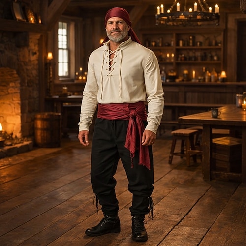 Set Medievale Rinascimento Pantaloni Copricapo Cintura in Vita con accessori Lunghe Pirata Allacciato Tinta unica Costume Per uomo 4 pezzi Costumi da pirata Halloween Carnevale Fiera Rinascimentale