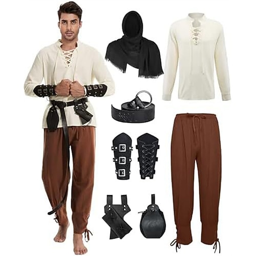 Medievale Rinascimento Pantaloni Cintura in Vita Camicia Lunghe Pirata Vichingo Ranger Allacciato Scollo a V Costume Per uomo Costumi da pirata Mascherata Feste Fiera Rinascimentale LARP Adulti