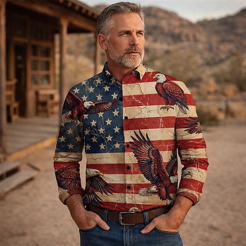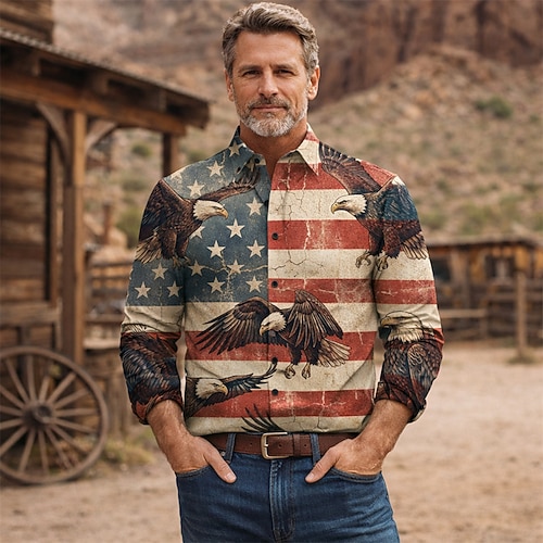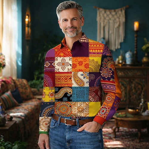 Americano 250 Retrò Vintage Anni '70 Camicia Camicia Aloha Lunghe Hippie Geometrico Etnico Costume Per uomo Mascherata 4 Luglio Casuale Feste Giorno dell'Indipendenza Adulti Camicia Primavera Tutte