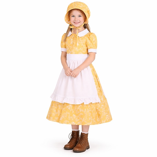 19° secolo anni 1800 Vecchio West Abito da prateria Set cuffia e grembiule Maniche corte Ragazza pioniera Coloniale Pioniere Guerra rivoluzionaria Floreale Costume Ragazze Halloween Carnevale