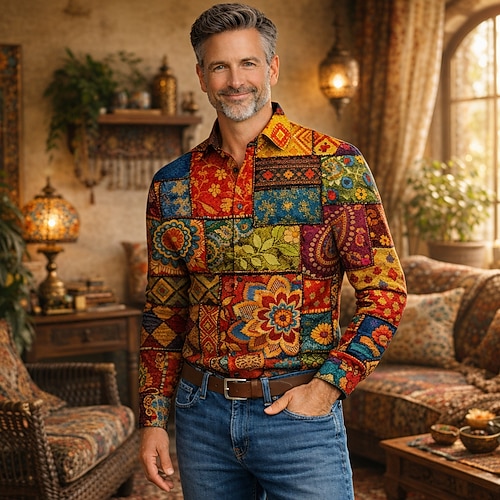 Retrò Vintage Anni '70 Camicia Camicia Aloha Lunghe Hippie Etnico Costume Per uomo Mascherata 4 Luglio Festival Musicale Feste Abbigliamento quotidiano Adulti Camicia