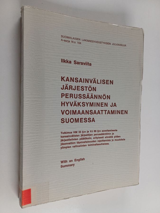 Ilkka Saraviita : Kansainvälisen järjestön perussäännön hyväksyminen ja voimaansaattaminen Suomessa : tutkimus HM 33 §:n ja VJ 69 §:n ...