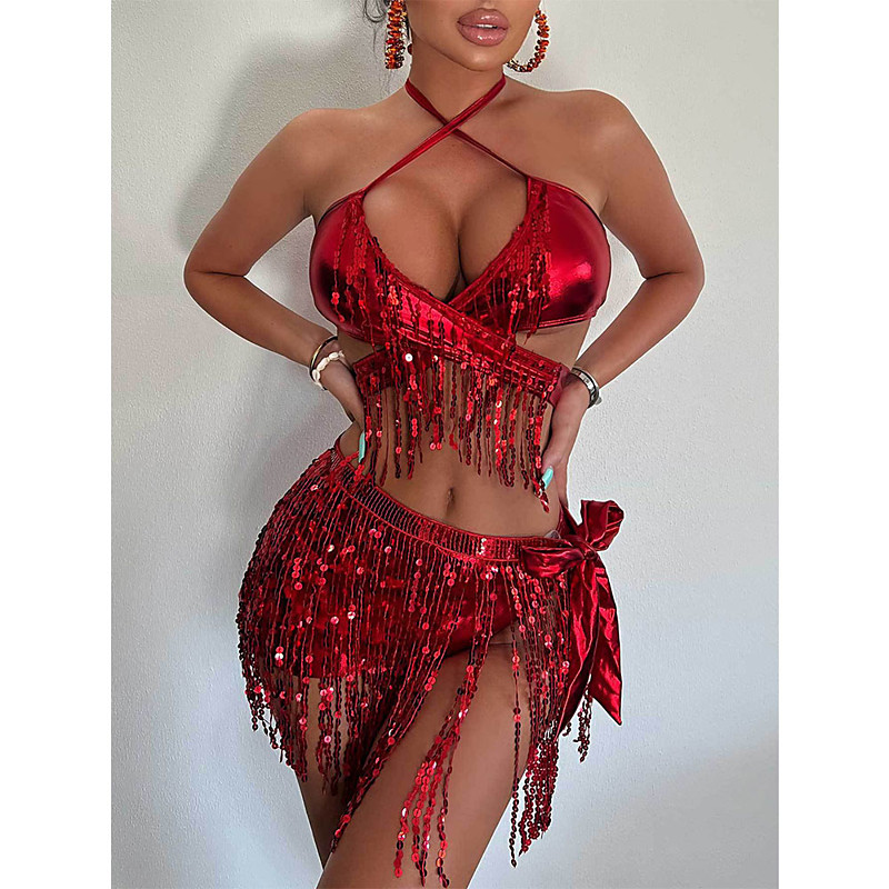 Carnival 2026Rio Carnival Samba Dancewear Women's Silver Sequin Fringe Crop Top Metallic Pleated Mini Skirt Set - Festival Rave Outfit for Carnival Brazil Festival Performance Costume
