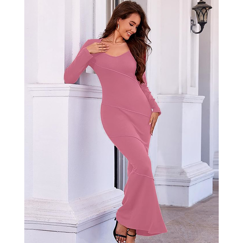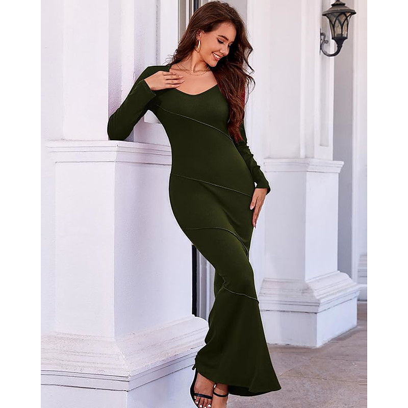 Women's casual long sleeve square neck Beveled Edge Design bodycon ribbed long dress