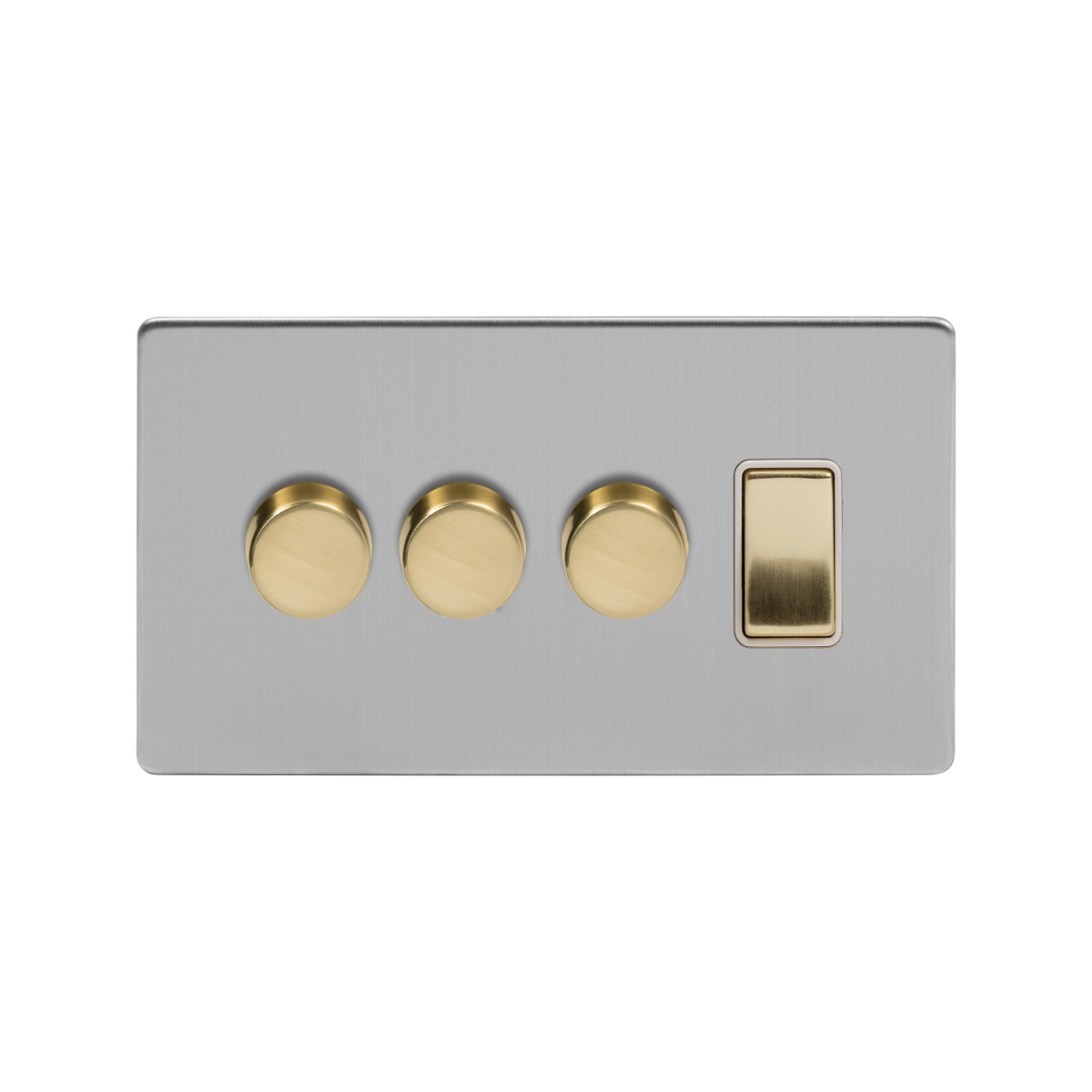 Soho Lighting Brushed Chrome & Brushed Brass 4 Gang Switch with 3 Dimmers (3x150W LED Dimmer 1x20A Switch)