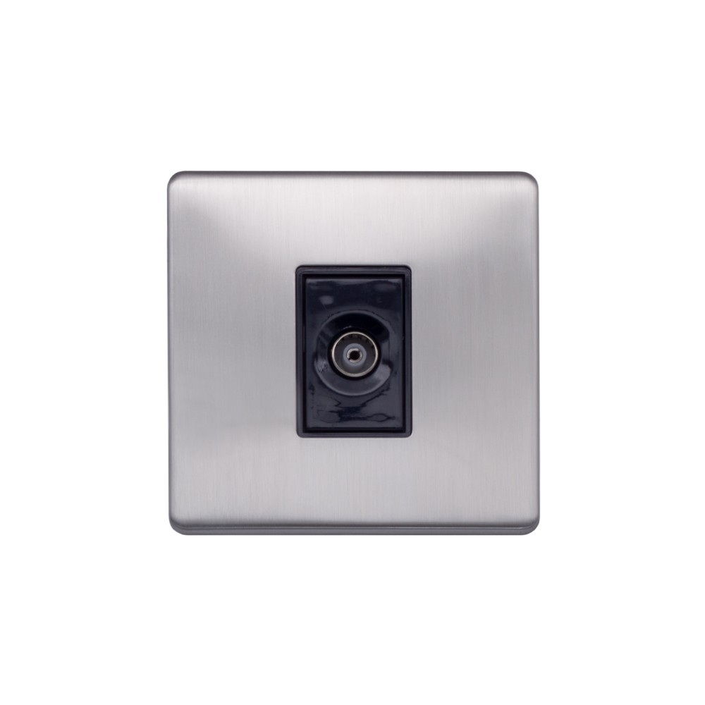 Lieber Brushed Chrome 1 Gang TV Aerial Socket - Black Insert Screwless - Size: 86mm x 86mm x 2.4 mm