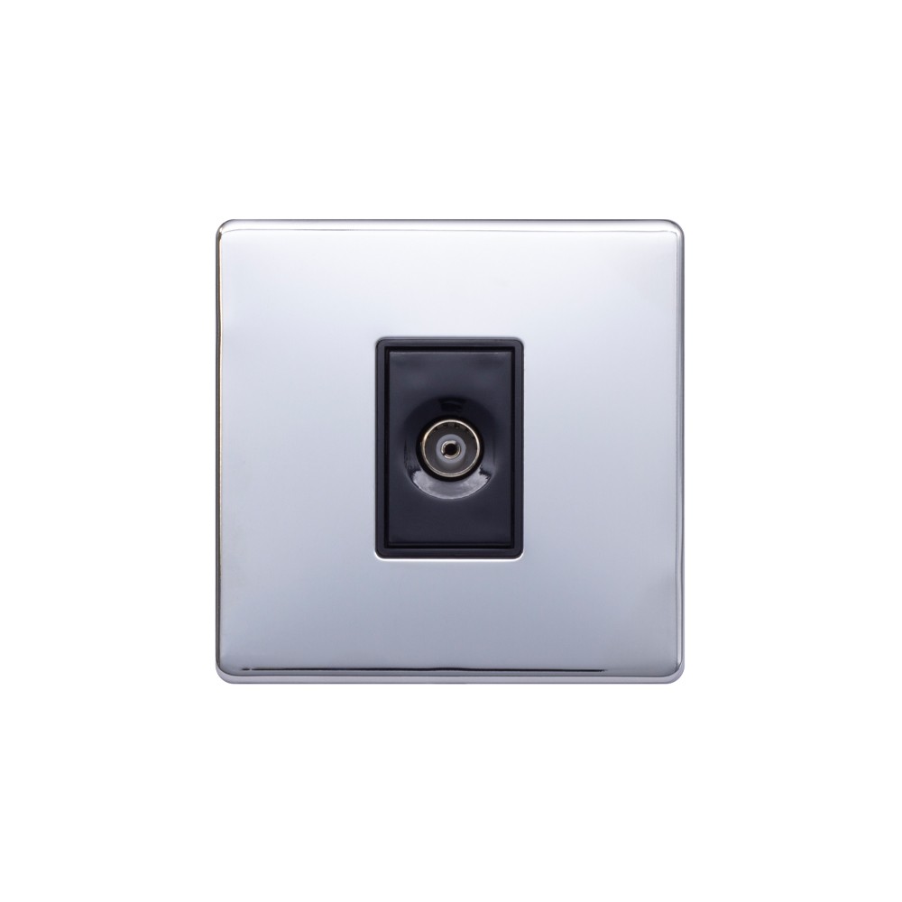 Lieber Polished Chrome 1 Gang TV Aerial Socket - Black Insert Screwless - Size: 86mm x 86mm x 2.4 mm