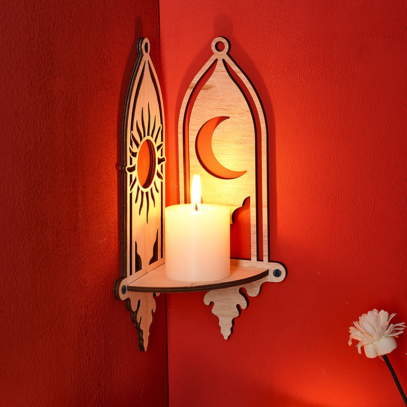 1PC Wooden Wall Decoration Sun and Moon Decoration Storage Corner Rack DIY Assembly Floating Shelf/Shelve Suitable for Home Wall Decoration Living Room Display Rack Ramadan Scene Decoration