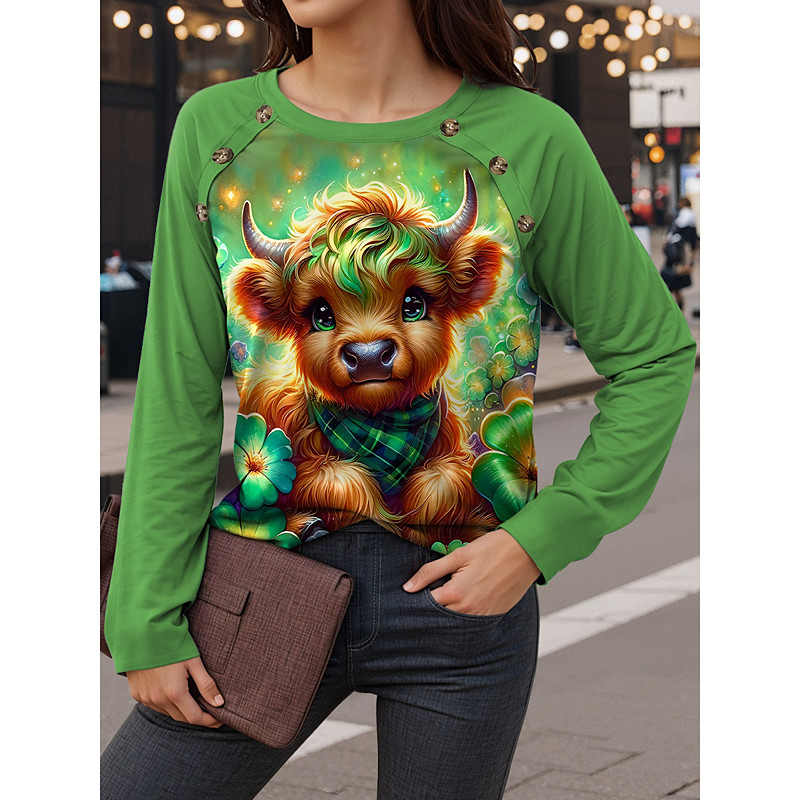St. Patrick's Day Women's Sweatshirt Cow Street Buttons Print Casual Crew Neck Long Sleeve Micro-elastic Fall Winter