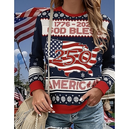 American 250th Women's Independence Day T Shirt Graphic Flag Stylish Casual Long Sleeve Crew Neck Regular Tops Daily Print Blue Black Spring Fall