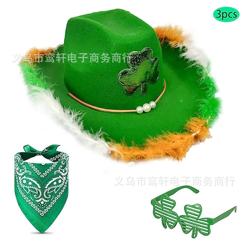 Set di 2 accessori per il giorno di San Patrizio, cappello da cowboy verde con piume, occhiali da sole a forma di cuore, bandana a forma di trifoglio, set di 3 costumi da folletto irlandese per