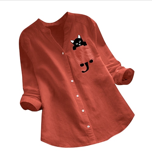 Per donna Camicia Blusa Camicie di cotone e lino Gatto Essenziale Moderno Scollo a V Quotidiano Stampato Bianco Giallo Verde militare Rosso Estate
