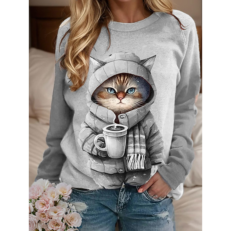 Women's Sweatshirt Cat Street Dailywear Print Casual Crew Neck Long Sleeve Micro-elastic Fall Winter Comfrt Breathable Soft Fabric