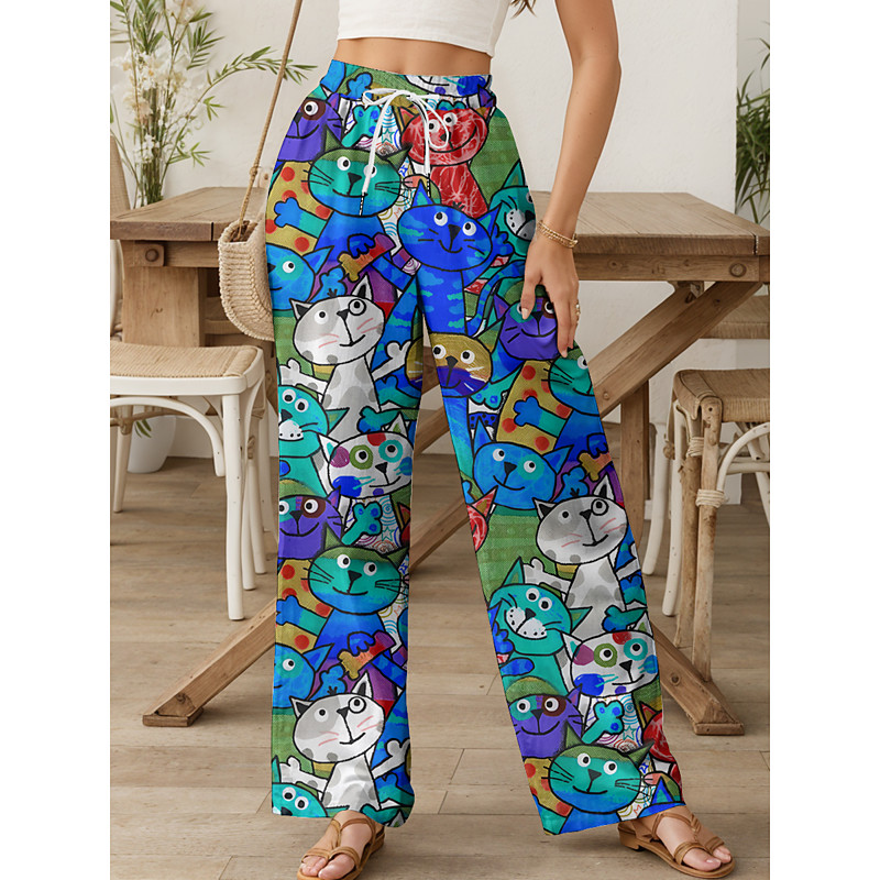 Women's Wide Leg Chinos Baggy Pants Vacation Vintage Fashion Full Length High Waist Graphic Animal Cat Printing Soft Breathable Micro-elastic Formal Outdoor Vacation Yellow Red Blue Purple Summer