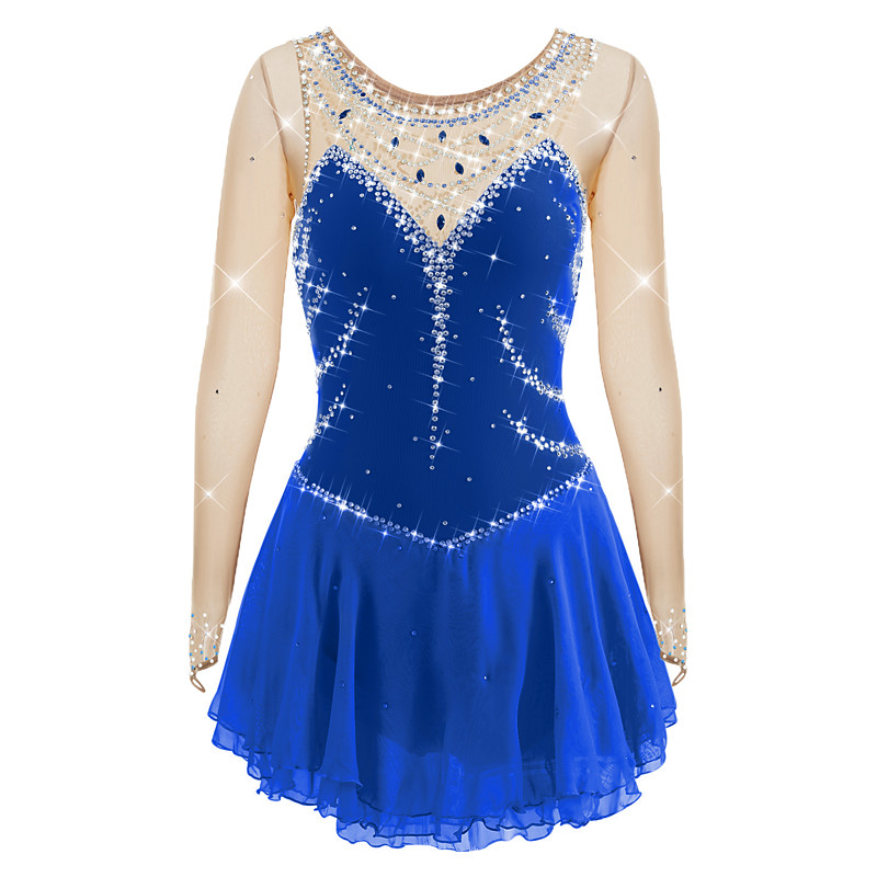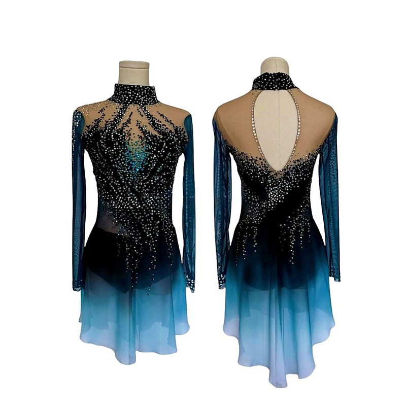 Figure Skating Dress Women's Girls' Ice Skating Dress BlackBlue Patchwork Asymmetric Hem Mesh Spandex High Elasticity Training Competition Skating Wear Classic Crystal / Rhinestone Long Sleeve Ice