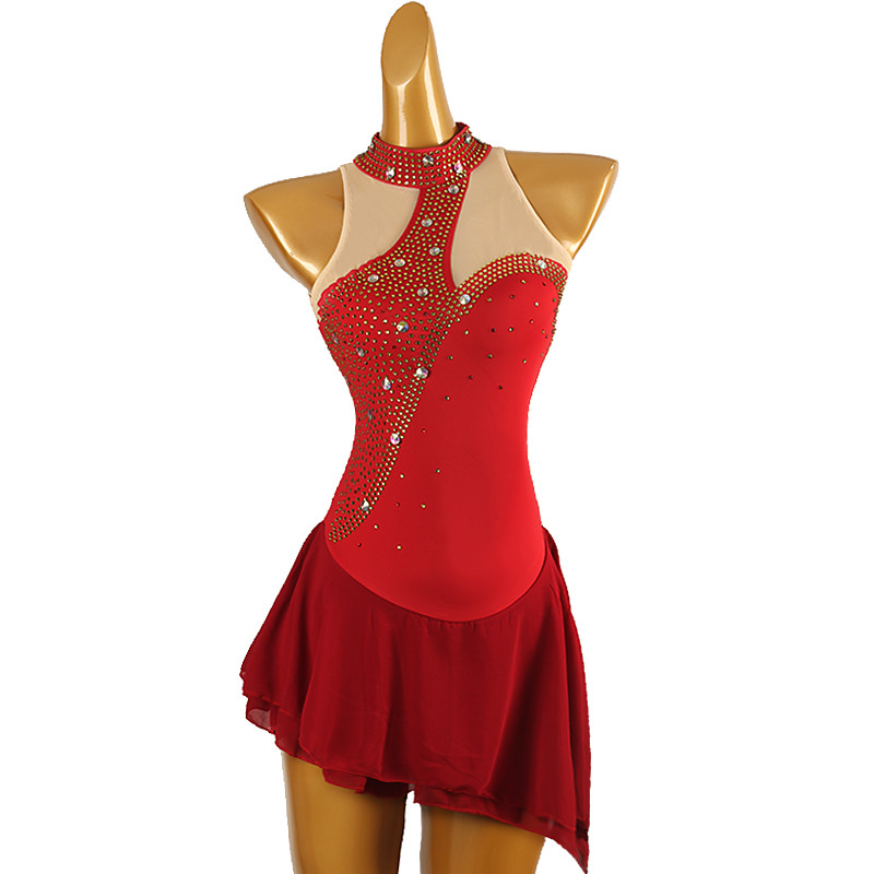 Figure Skating Dress Women's Girls' Ice Skating Dress Black Red Thumbhole Asymmetric Hem Mesh Spandex Stretchy Training Practice Professional Skating Wear Thermal Warm Classic Crystal / Rhinestone
