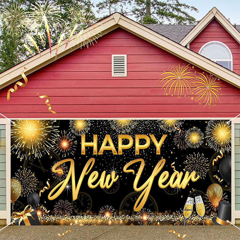 New Year Tapestry Garage Door Cover Large Hanging Backdrop 2026 Fireworks Cute 3D Party Outdoor Holiday Shooting Backgrounds Yard Home Decor