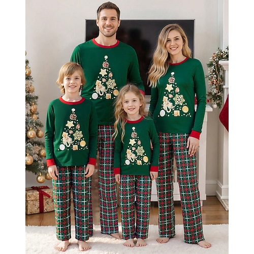 Familie Weihnachten Weihnachtspyjama für die Familie Schlafanzug Familiensets Grafik Weihnachtsbaum Schneeflocke Heim Druck Grün Langarm Täglich Passende Outfits