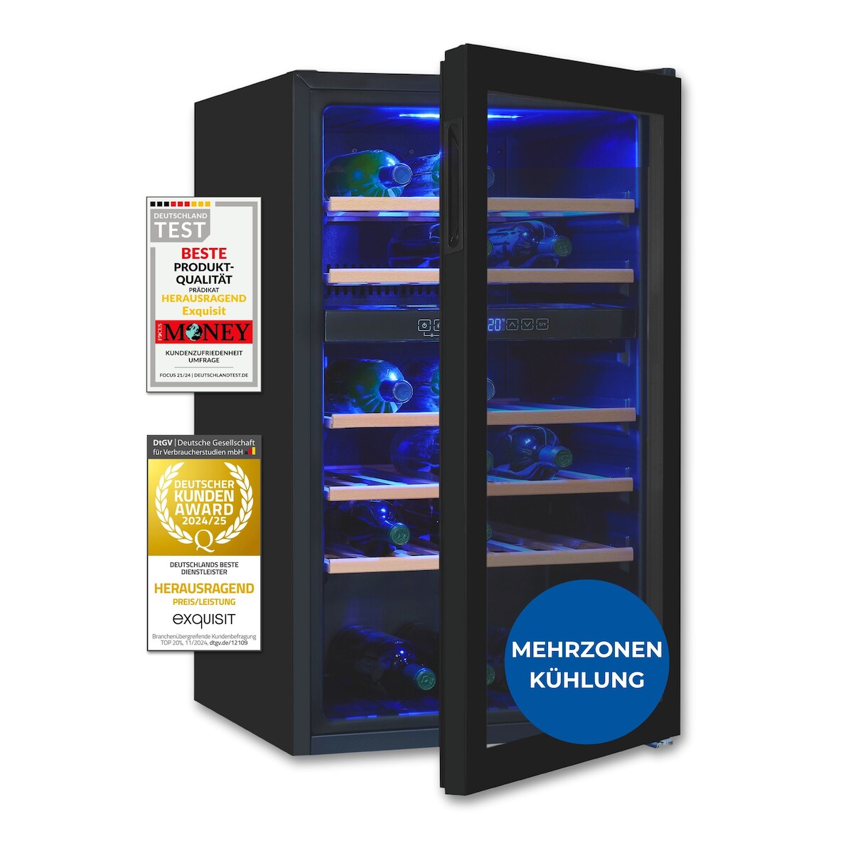 Exquisit Weinkühlschrank 2 Zonen, Platz für 45 Flaschen, 119 l, Umluftventilator, 5 Holzablagen, Digitale Temperaturanzeige, WS2-45-GTE-160G schwarz