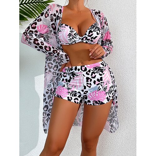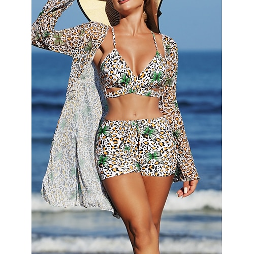 Frauen Bikini 3-teiliges Badeanzug Unterdraht Leoparden Shorts Schlank Rückenfrei Urlaub Strandbekleidung V-Hals Ärmellose Badeanzüge